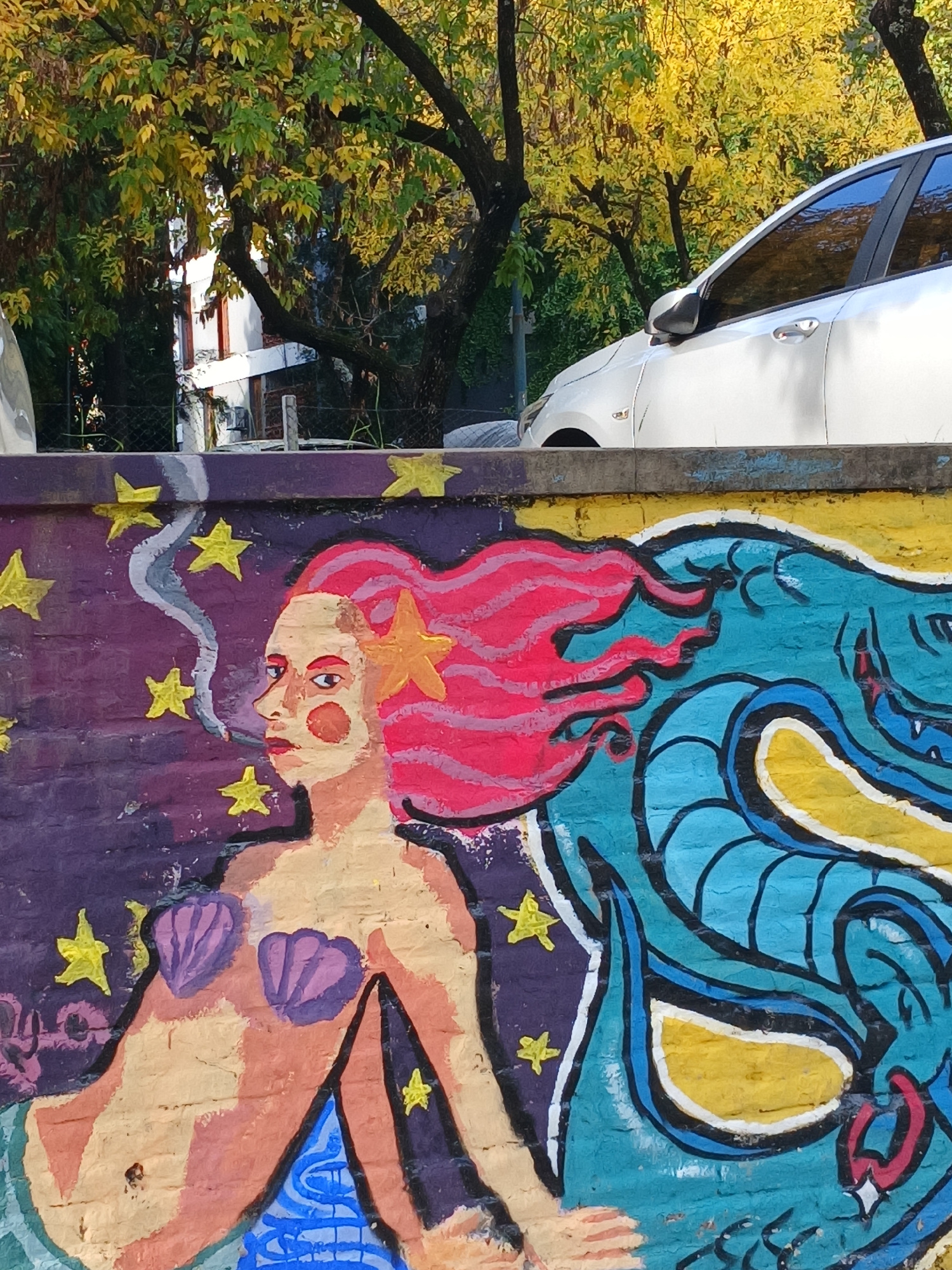 The image shows a mural depicting a mermaid with red hair and a starfish in her hair. She is wearing seashell bra cups and surrounded by stars. Above her is a multi-headed sea monster. The mural is pa…read more