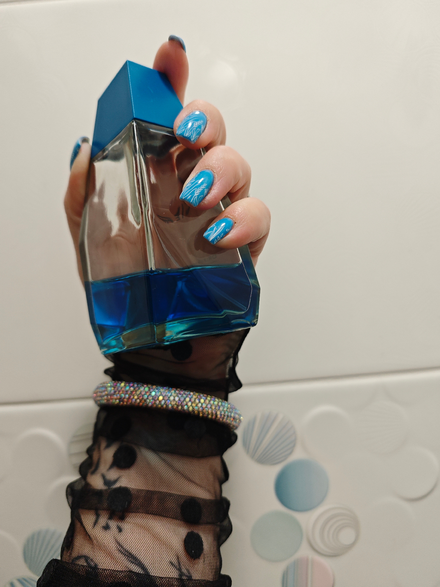 A hand holds a bottle of blue liquid against a patterned tile background. The hand wears a black polka-dot mesh sleeve and a sparkling bracelet. The fingernails are painted blue with a white leaf desi…read more