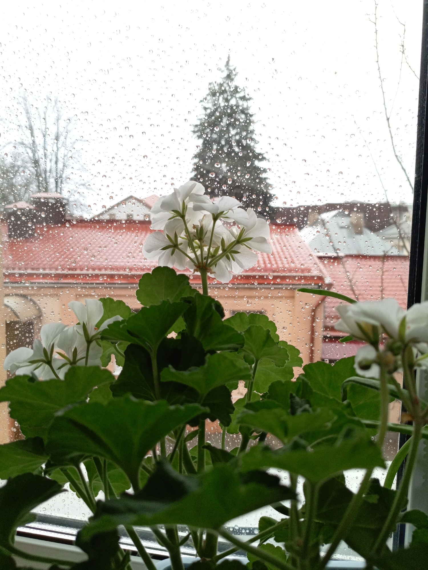 The image depicts a view from a window in Hrodna, Belarus during a rain shower. Raindrops are visible on the windowpane. Through the window, one can see red-tiled rooftops of buildings, a conifer tree…read more