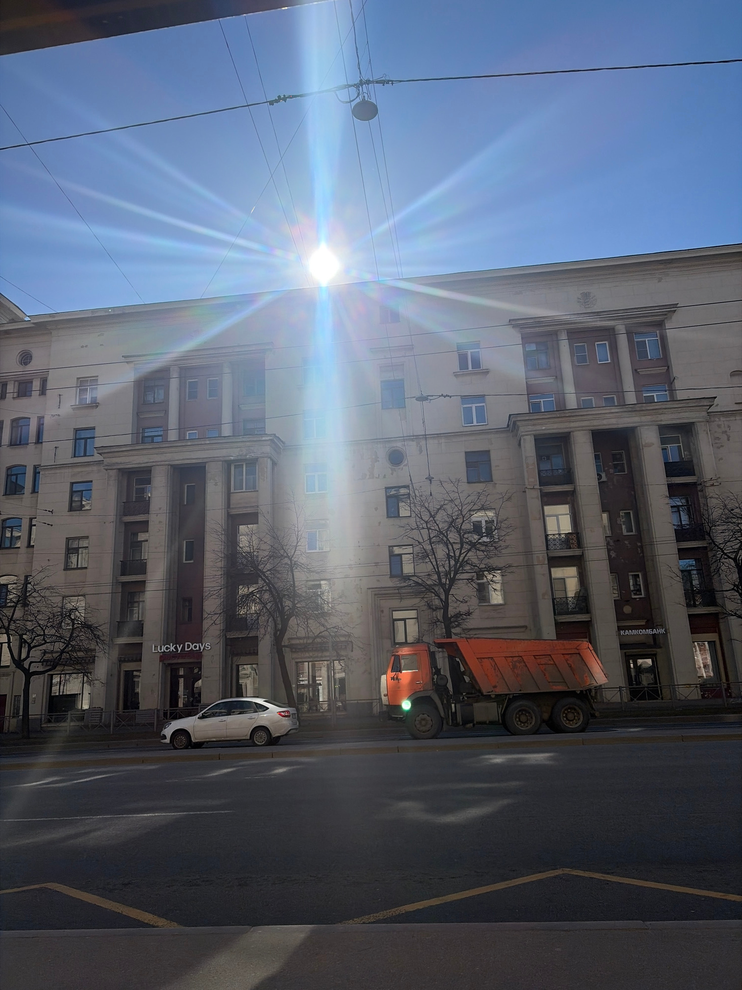 The image depicts a street scene in Saint Petersburg, Russia. A large, light-colored building occupies the left side of the frame. A tree without leaves stands in front of the building. An orange dump…read more