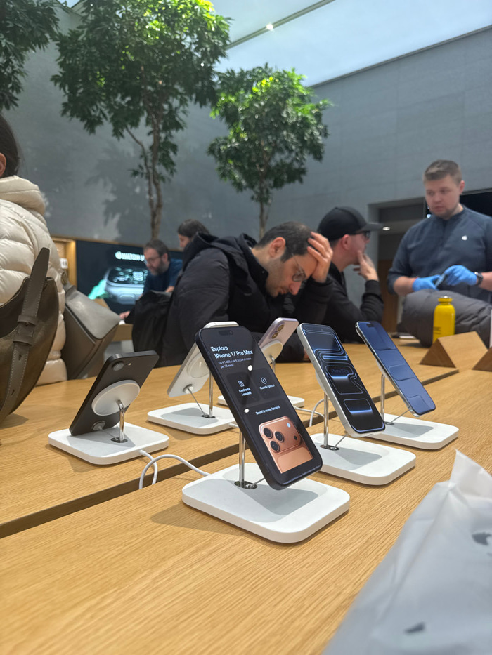 The image captures an indoor scene within what appears to be an Apple Store in Milan, Italy. Several people are present, browsing or working amidst modern product displays. In the foreground, a light…read more
