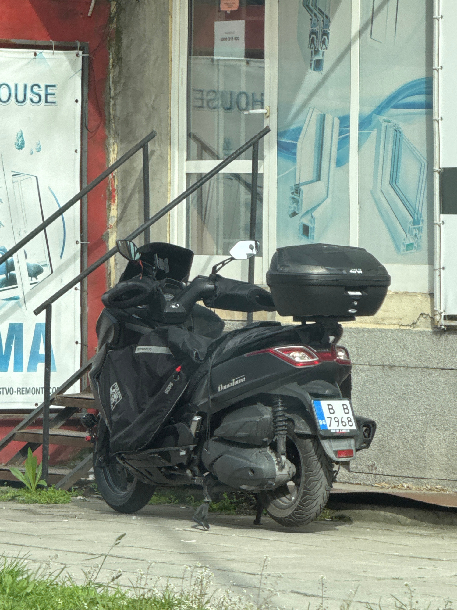 A black scooter with a GIVI top case is parked on a sidewalk in front of a building. The scooter has a Bulgarian license plate that reads "BB BG 7968." The scooter has bags on it and is partially obs…read more