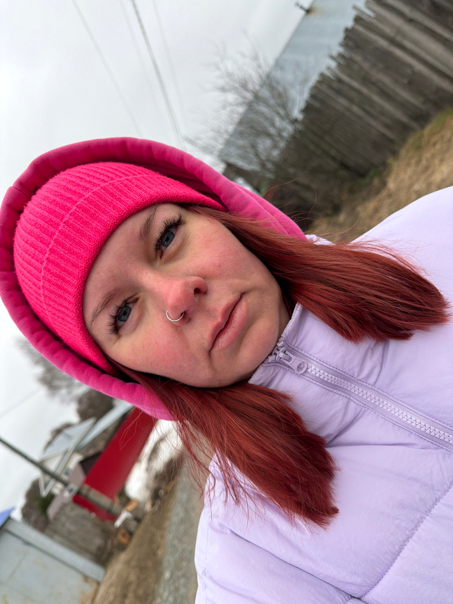 The image shows a person wearing a pink beanie and a light purple puffer jacket. The person has red hair and a silver nose ring. The background appears to be an outdoor environment with a blurred fenc…read more