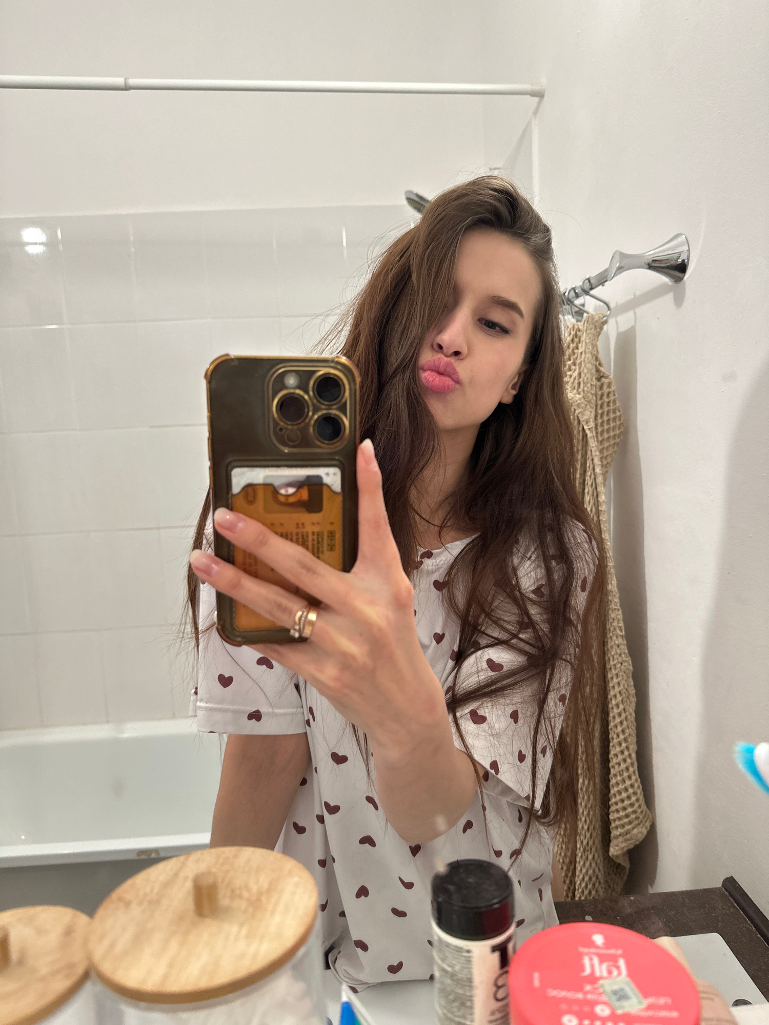 A woman is taking a selfie in a bathroom. She is wearing a white pajama top with small heart patterns. She is pouting for the camera while holding a gold-colored smartphone. The bathroom has white tilβ¦read more