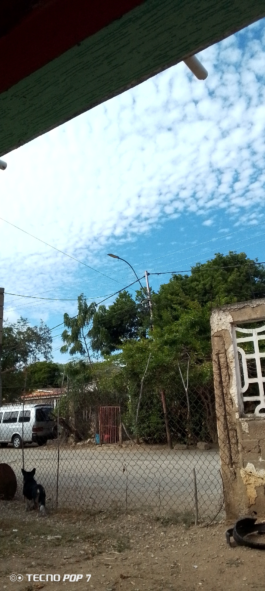 View from a shaded area towards a street in Altagracia, Venezuela. The sky is blue with scattered white clouds. Utility poles with wires are visible. A black and white dog stands in the yard behind a…read more