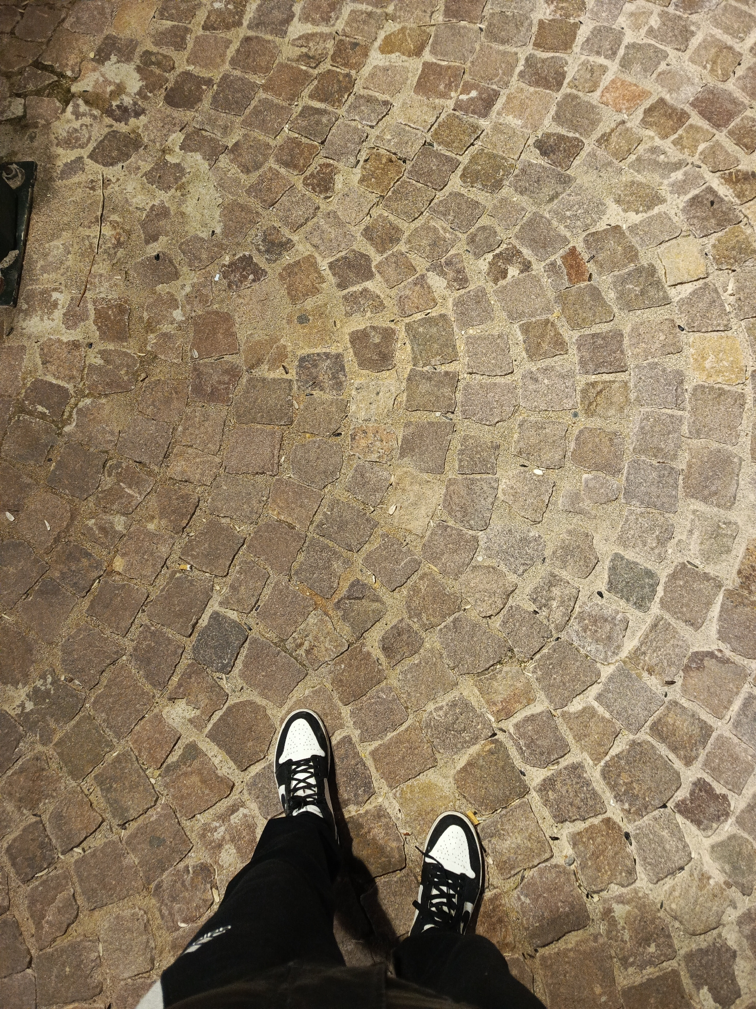 A high-angle, eye-level shot depicts a person standing on a cobblestone pavement in Meknes, Morocco. The cobblestones are predominantly brownish-gray and arranged in a circular pattern. The person is…read more