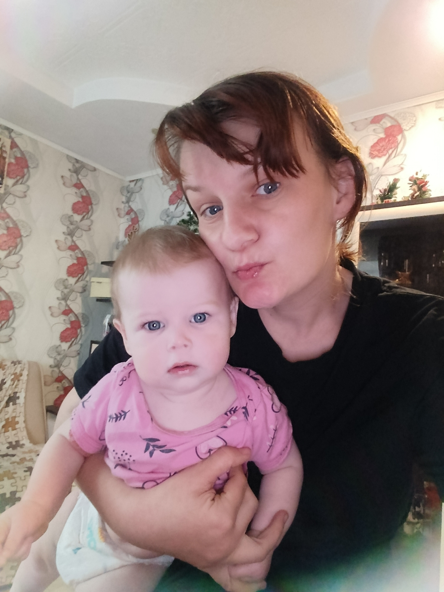 A photograph depicts a fair-skinned woman holding a baby, both with light blue eyes, in an indoor environment. The woman has short brown hair with bangs and is wearing a black t-shirt. Her face is clo…read more