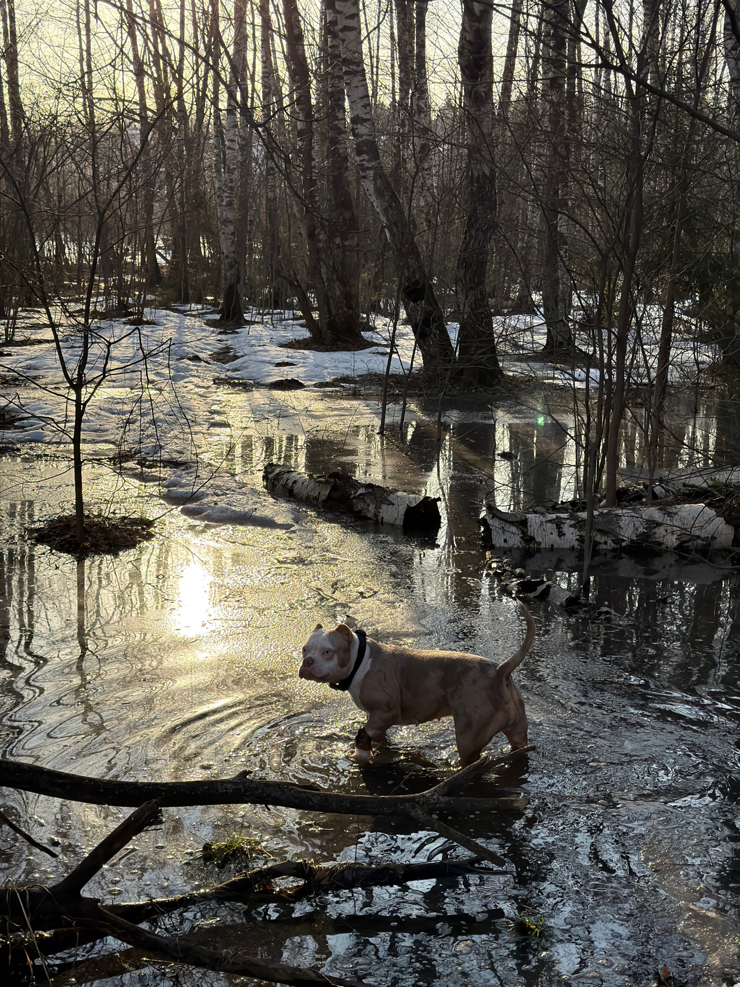 This image captures a wooded area in Khimki, Russia, during what appears to be late winter or early spring. A light-colored American Bully-type dog, featuring tan/brindle fur with white markings on it…read more