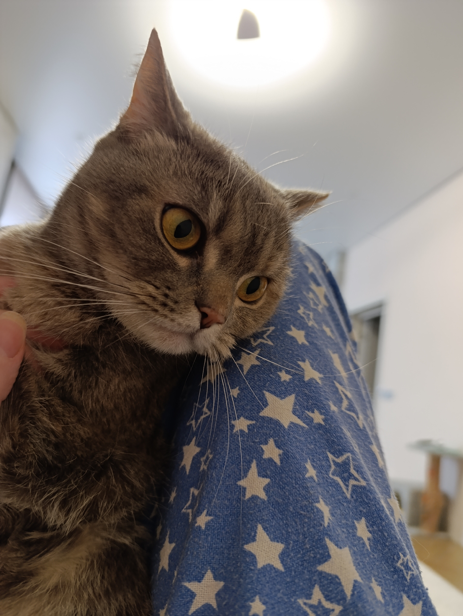 A close-up shot shows a light brown and gray tabby cat with yellow eyes being held or resting against a blue fabric covered with white stars. A partial view of a hand is visible on the left side of th…read more
