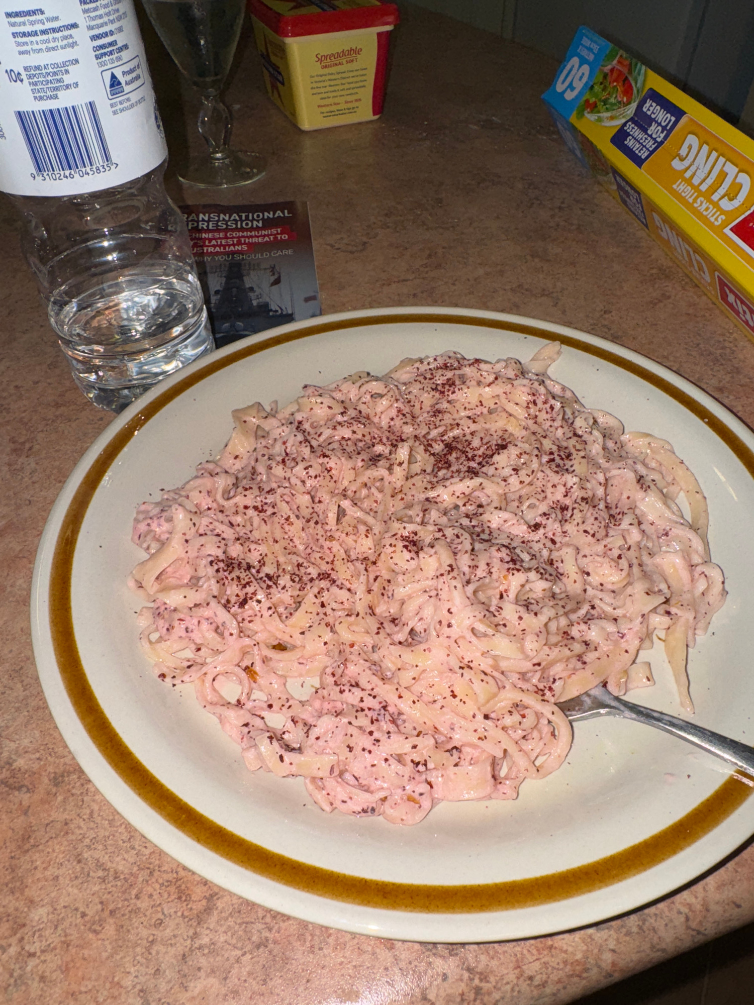 The image shows a countertop scene featuring a bowl of pasta, likely fettuccine, covered in a pink sauce and speckled with dark reddish-brown seasoning, probably sumac. A silver fork rests in the bowl…read more