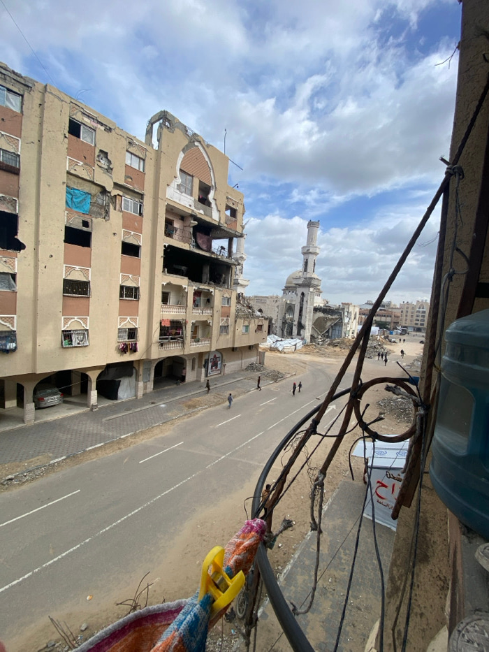 The image depicts a street view in Khan Yunis, Palestinian Territory, showing widespread structural damage under a partly cloudy sky. In the foreground, from an elevated perspective, a dark metal balc…read more