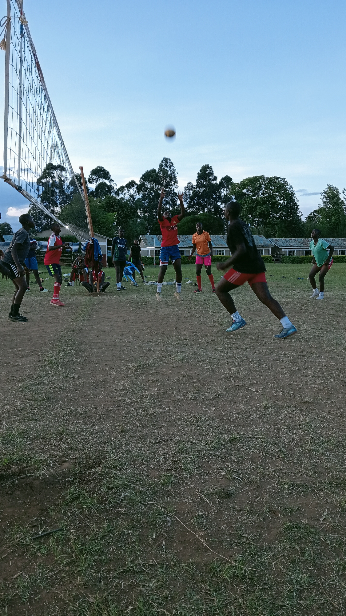 A group of individuals are engaged in a volleyball game on a dirt field in what appears to be the Lumakanda ward in Kenya. A volleyball net is erected on the left side of the scene. Several players arβ¦read more