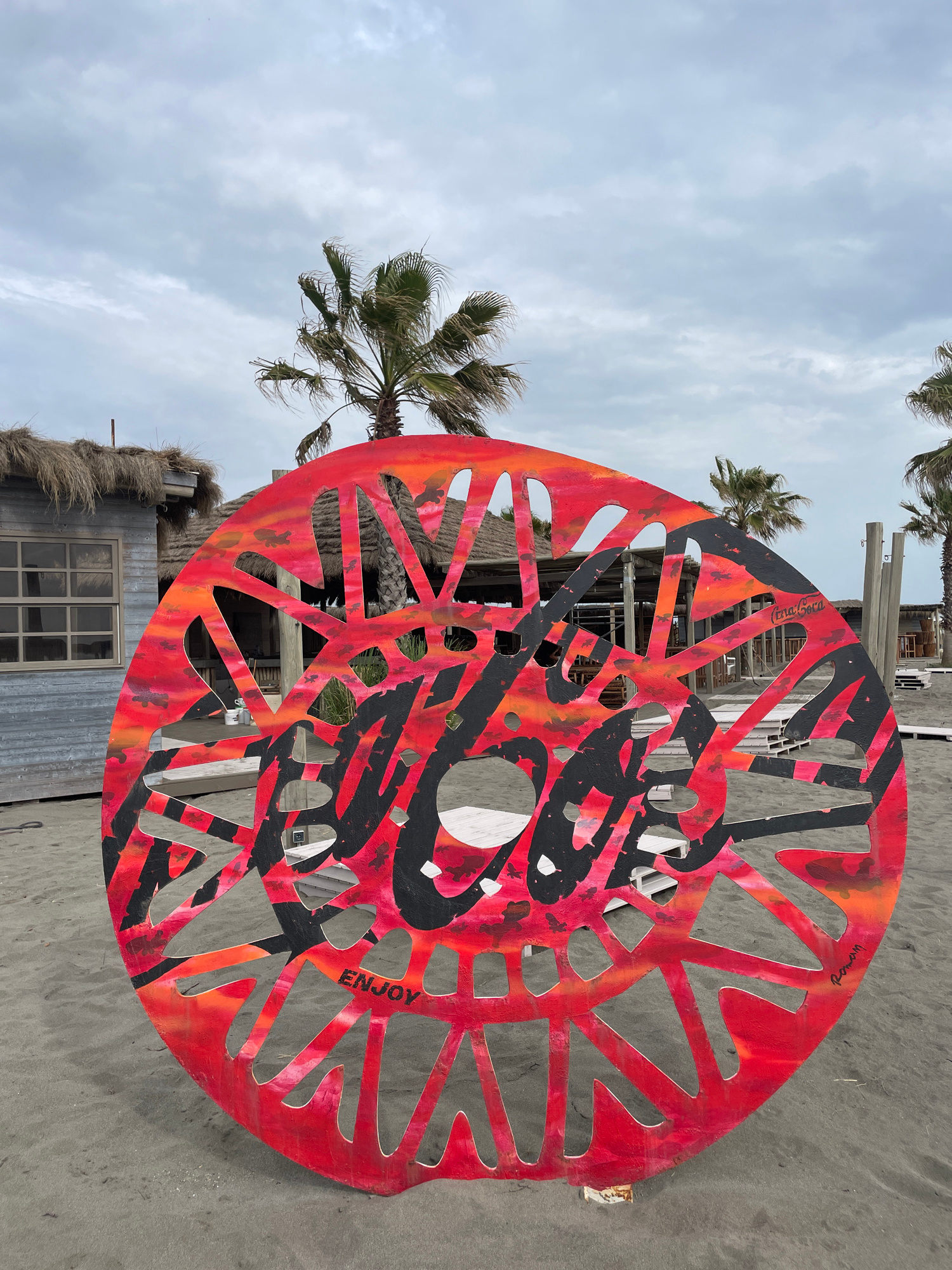 The image captures a vibrant, large, circular wooden art piece in the foreground, set against a coastal backdrop. The art piece is painted in striking reds and oranges, accented with bold black spray…read more