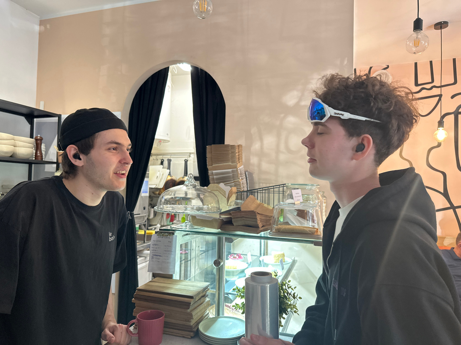 The photograph captures an interaction between two individuals in what appears to be a cafe or bakery setting. On the left, a young man with dark hair, wearing a black beanie and a black t-shirt with…read more