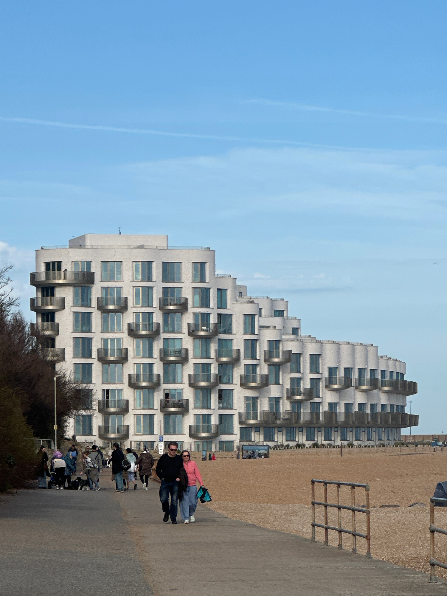 The image shows the Grand Burstin Hotel in Folkestone, United Kingdom, a large, white building with a terraced, step-like design. Each level features numerous windows. To the right of the building, th…read more