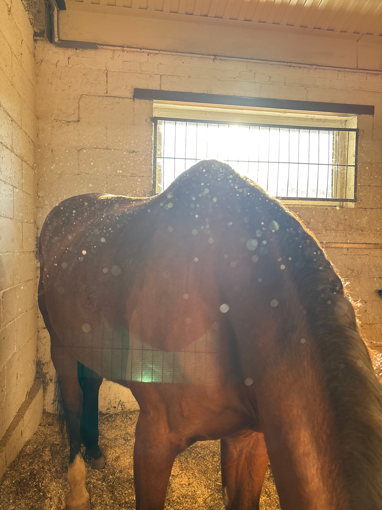 The image captures a sunlit interior, likely a stable or barn, focusing on the rear and side of a reddish-brown horse. The photo is oriented vertically, showing the horse standing on a floor of light-…read more