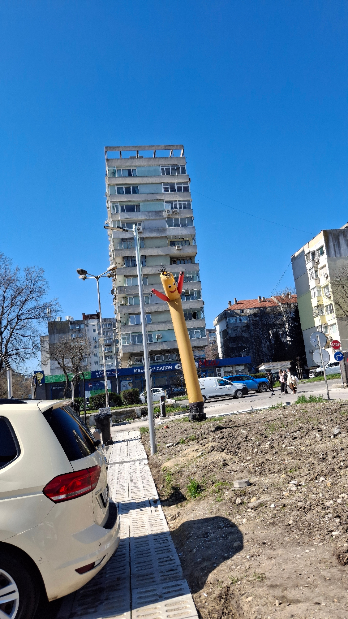 The image shows a street scene in Varna, Bulgaria, featuring a tall, narrow, yellow inflatable tube man with red accents standing on the sidewalk. Behind it is a tall, rectangular apartment building w…read more
