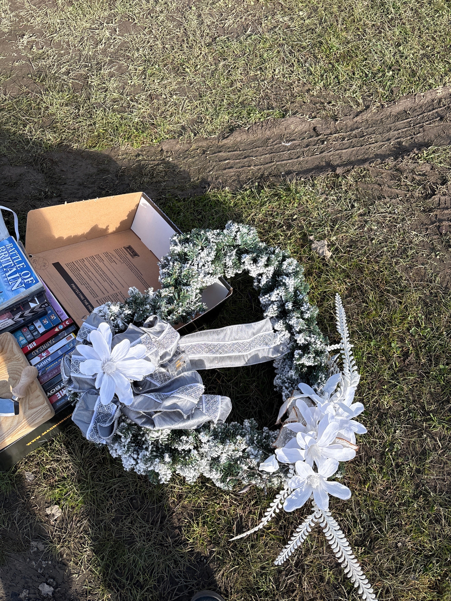 The scene shows a Christmas wreath, decorated with white flowers and silver ribbon, lying on a grassy area adjacent to a muddy track. A partially open cardboard box is positioned next to the wreath. T…read more