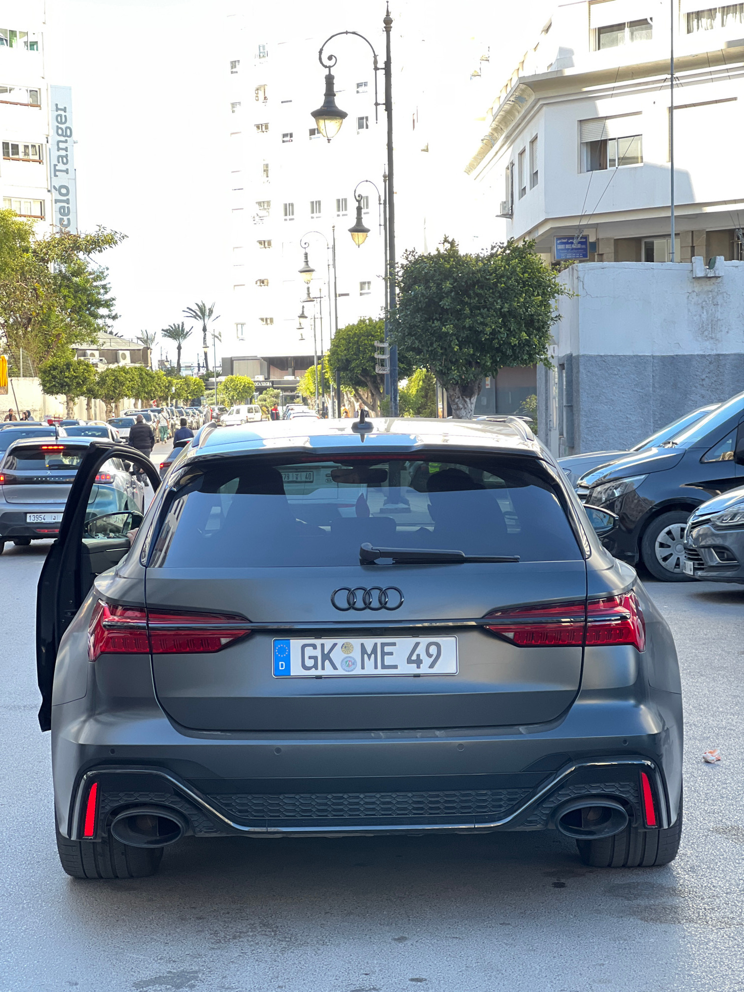 The image displays the rear view of a dark grey, satin-finish Audi RS6 Avant stationed on an asphalt road in Tanger, Morocco. The vehicle exhibits a German license plate, "GK ME 49", which includes th…read more
