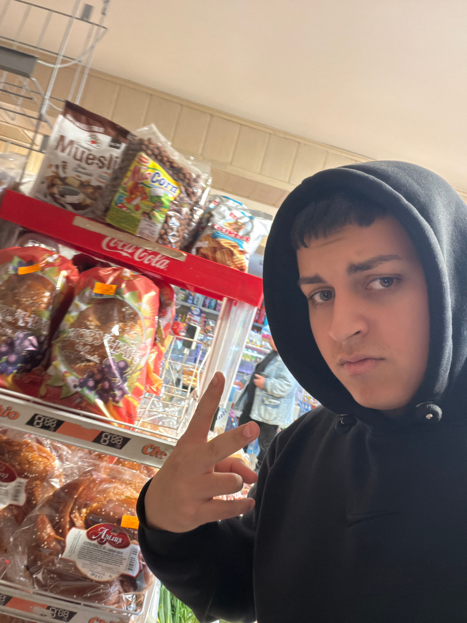 A young person wearing a black hooded sweatshirt is in a grocery store aisle, taking a selfie. The camera is angled upwards, capturing their face from a low perspective. The person is making a hand ge…read more