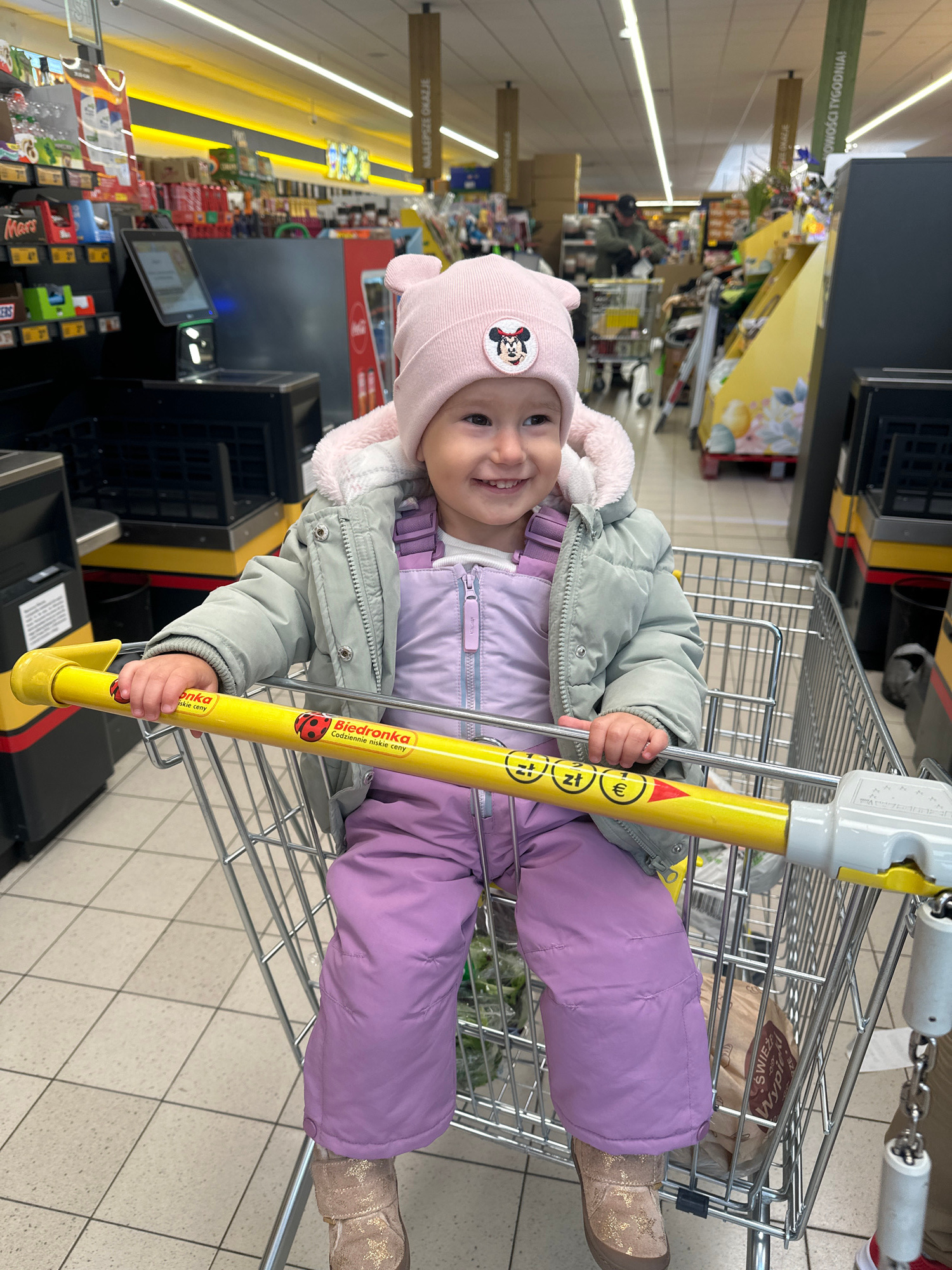 A young child wearing a pink hat and purple snowsuit is sitting in a shopping cart in a Biedronka store. The shopping cart has a yellow handle with Biedronka branding. The store has various product sh…read more