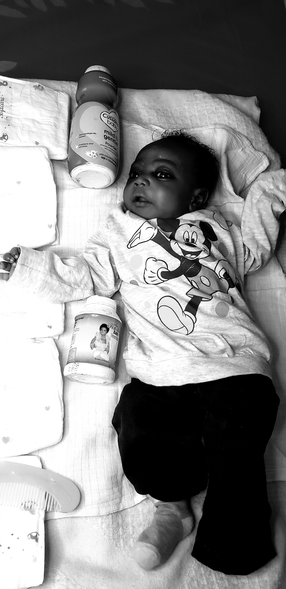 The image depicts an infant lying in a crib. The baby wears a light-colored top with a Mickey Mouse design and dark pants. The crib contains diapers, baby powder, and a comb. The location is Narayi, N…read more