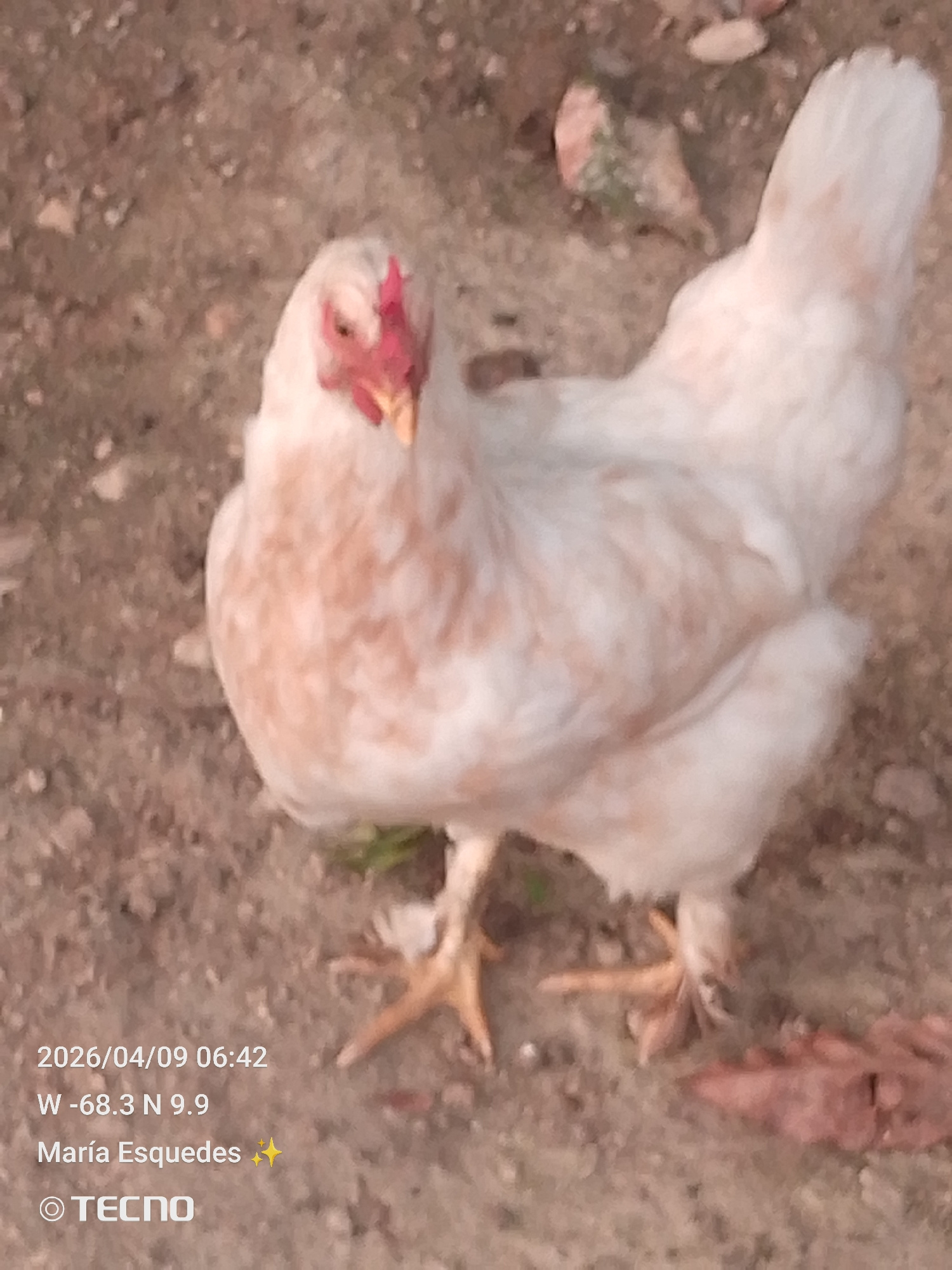 A hen with white and light brown plumage stands on a dirt ground. The hen has a red comb. The image's timestamp indicates it was taken on 2026/04/09 at 06:42. The location metadata suggests the photog…read more