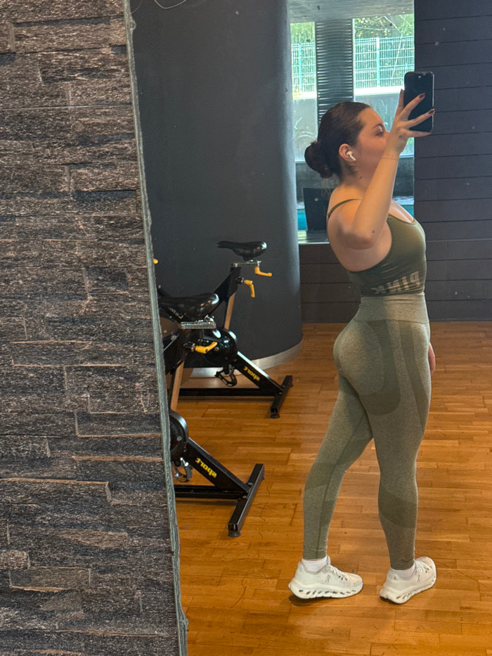 The image displays a female individual taking a mirror selfie within a gym or fitness center, located in Mexico City, Mexico. The subject, positioned with a slight side profile, is reflected in a larg…read more