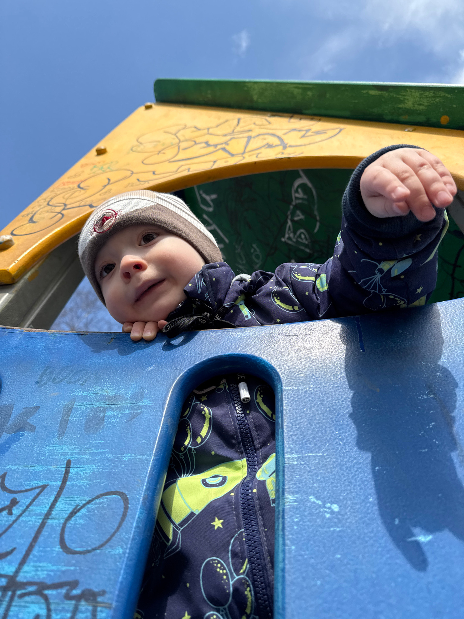 A young child peeks down from a brightly colored playground structure, captured from a low-angle perspective in Izhevsk, Russia. The child, likely a toddler, wears a dark blue winter jacket patterned…read more