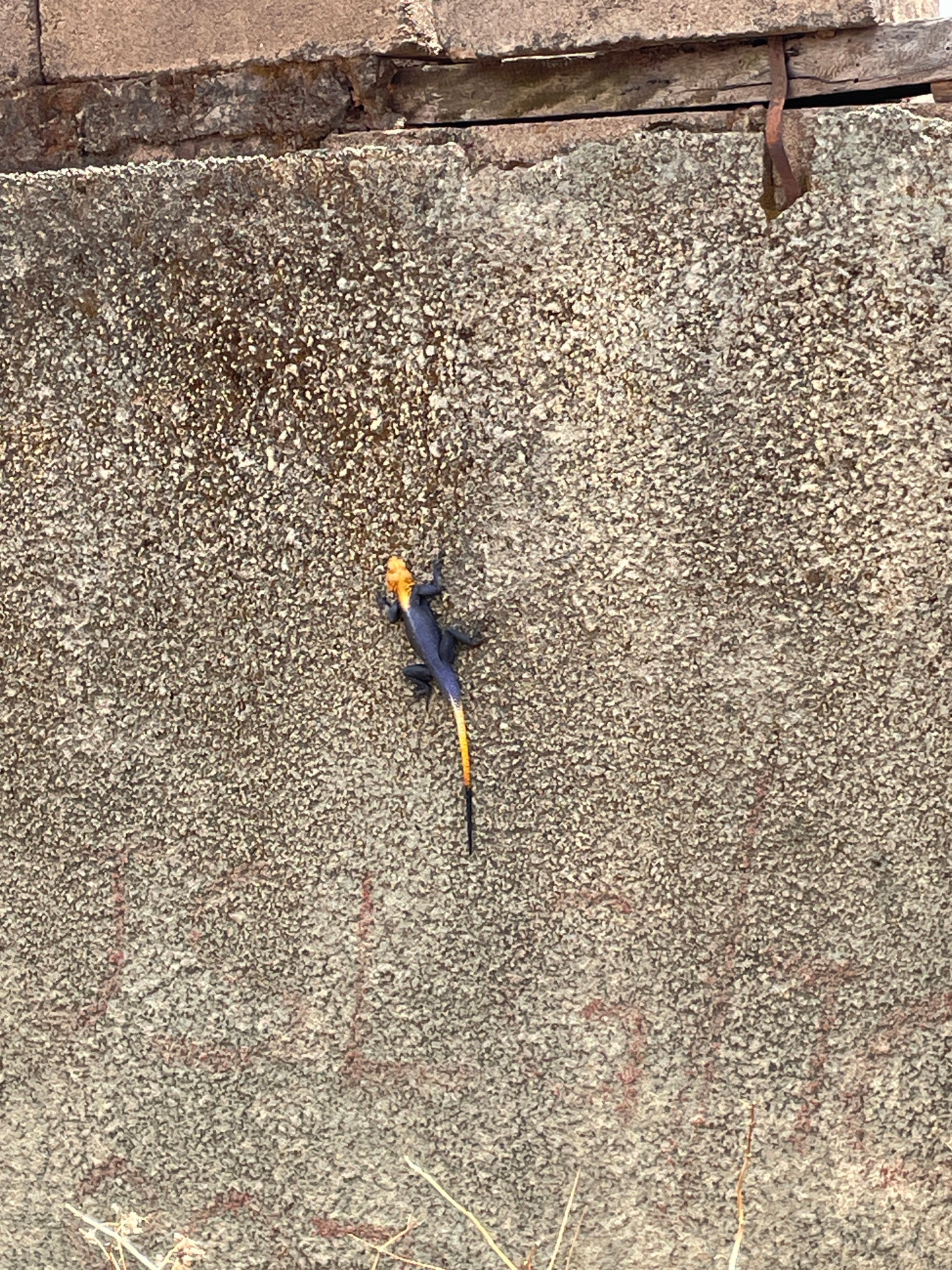 A lizard is clinging to a rough, textured concrete wall. The lizard has a black body, an orange head, and a long, thin orange tail. The wall is mottled in shades of gray and beige. A rusty metal objec…read more