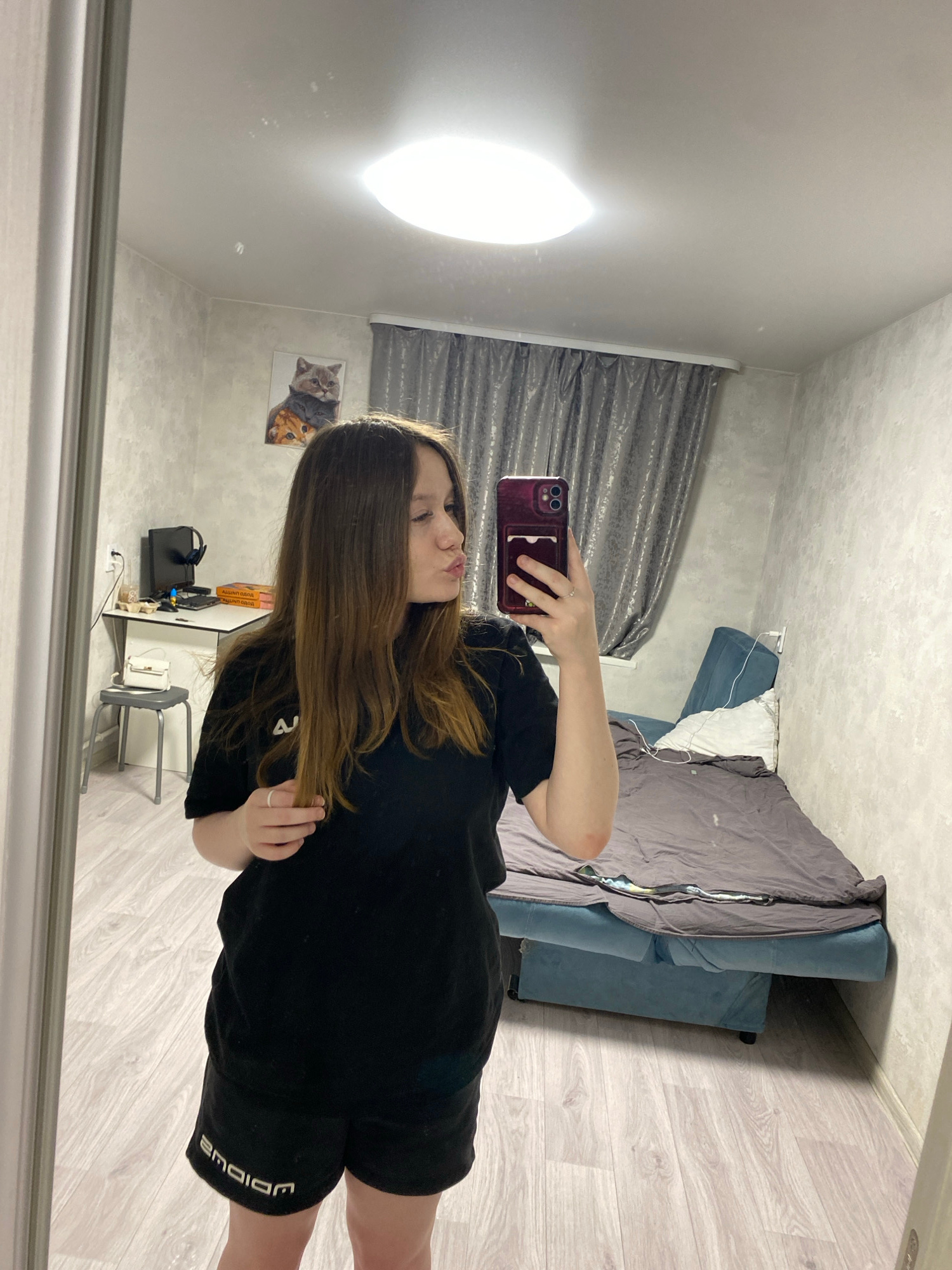 The image depicts a woman taking a selfie in what appears to be a bedroom. She is holding a maroon-colored smartphone in her left hand. She is wearing a black t-shirt and black shorts with white writiβ¦read more