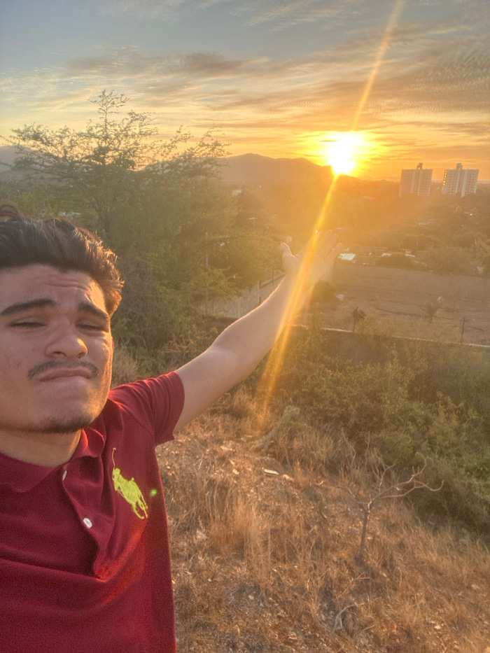 The image captures a male individual positioned in the foreground, approximately from the chest up, against a sunset or sunrise landscape in Juan Griego, Venezuela. The subject, with dark hair, a must…read more