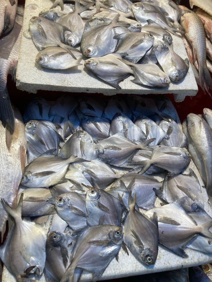 A market display showcases piles of silver pomfret fish. The fish are arranged on two white styrofoam trays, one on the left and one on the right. Some smaller fish are scattered at the top and bottom…read more