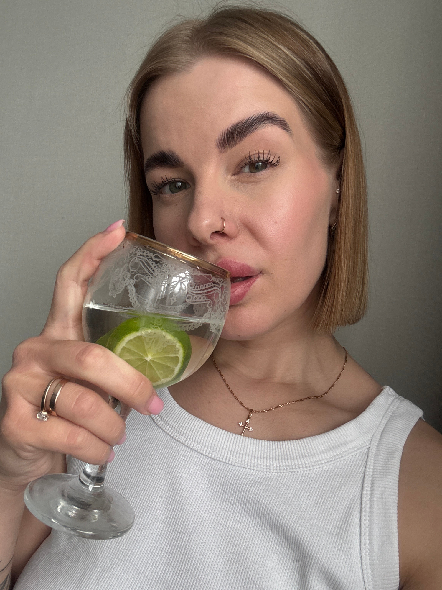 A woman with short, light brown hair, light skin, and fair eyebrows is holding a cocktail glass with a lime slice in it. She is wearing a white ribbed tank top and a thin gold necklace with a cross peβ¦read more
