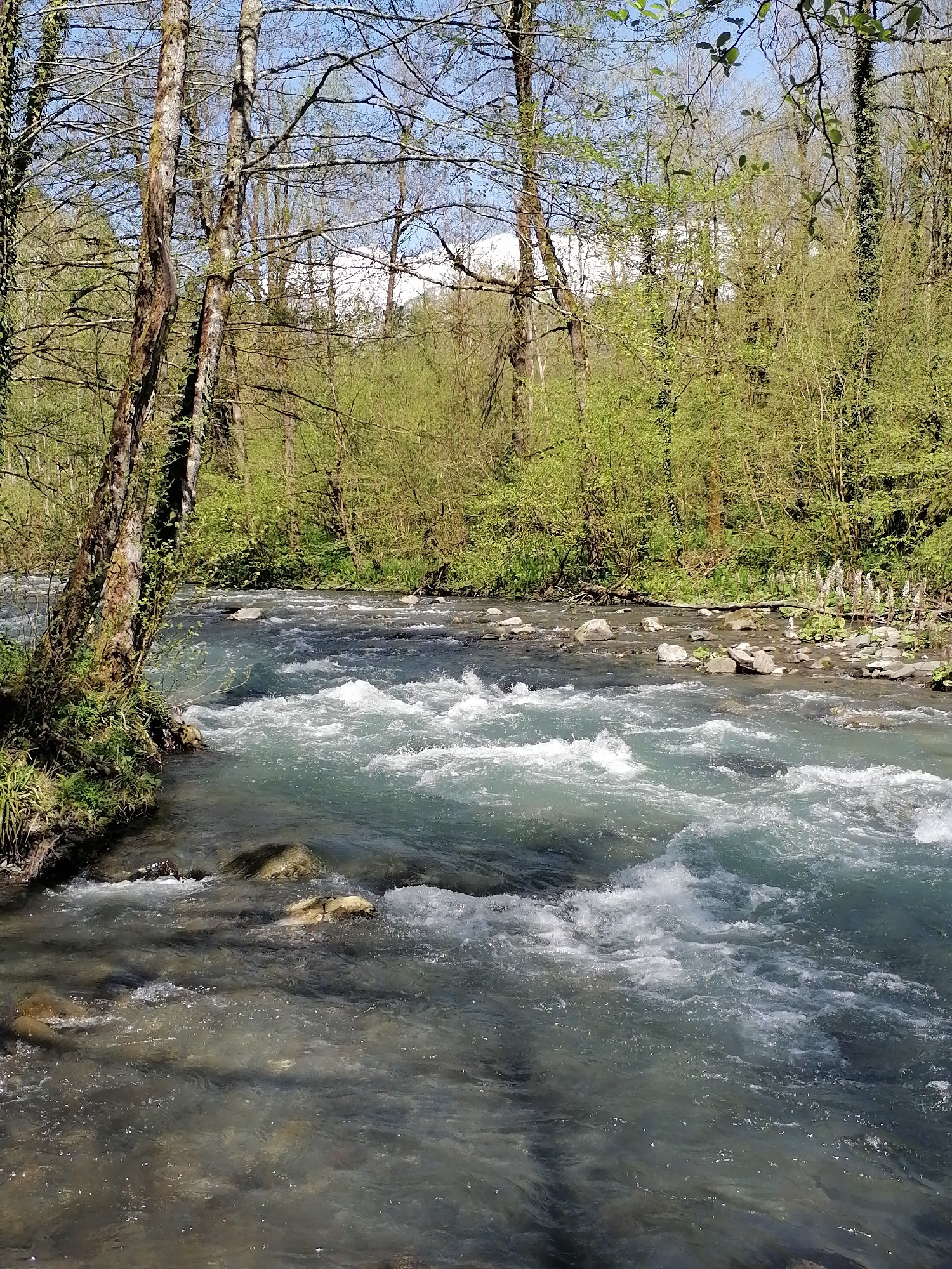 The photograph presents a serene natural landscape of a river flowing through a forest in Chvizhepse, Russia. The scene is dominated by a clear, dynamic river with sections of white, frothy rapids ind…read more