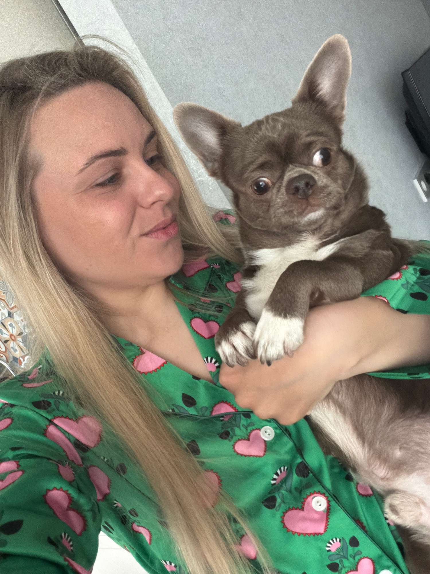 An indoor, overhead shot captures a blonde-haired woman holding a small, brown and white dog in what appears to be a cozy, domestic setting in Votkinsk, Russia. The image is taken at an angle, with th…read more