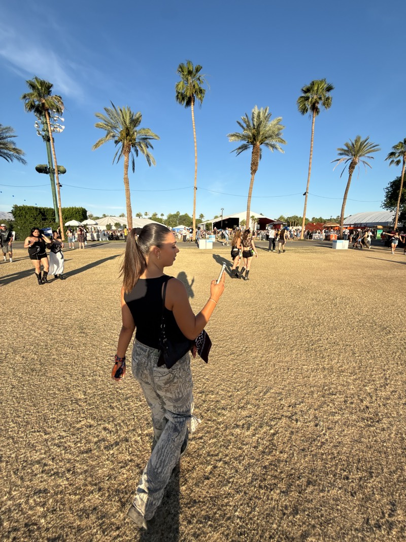 A woman walks through a dry grassy field, likely at the Coachella Valley Music and Arts Festival in Indio, California. She is wearing a black tank top, patterned pants, and a black shoulder bag. She i…read more