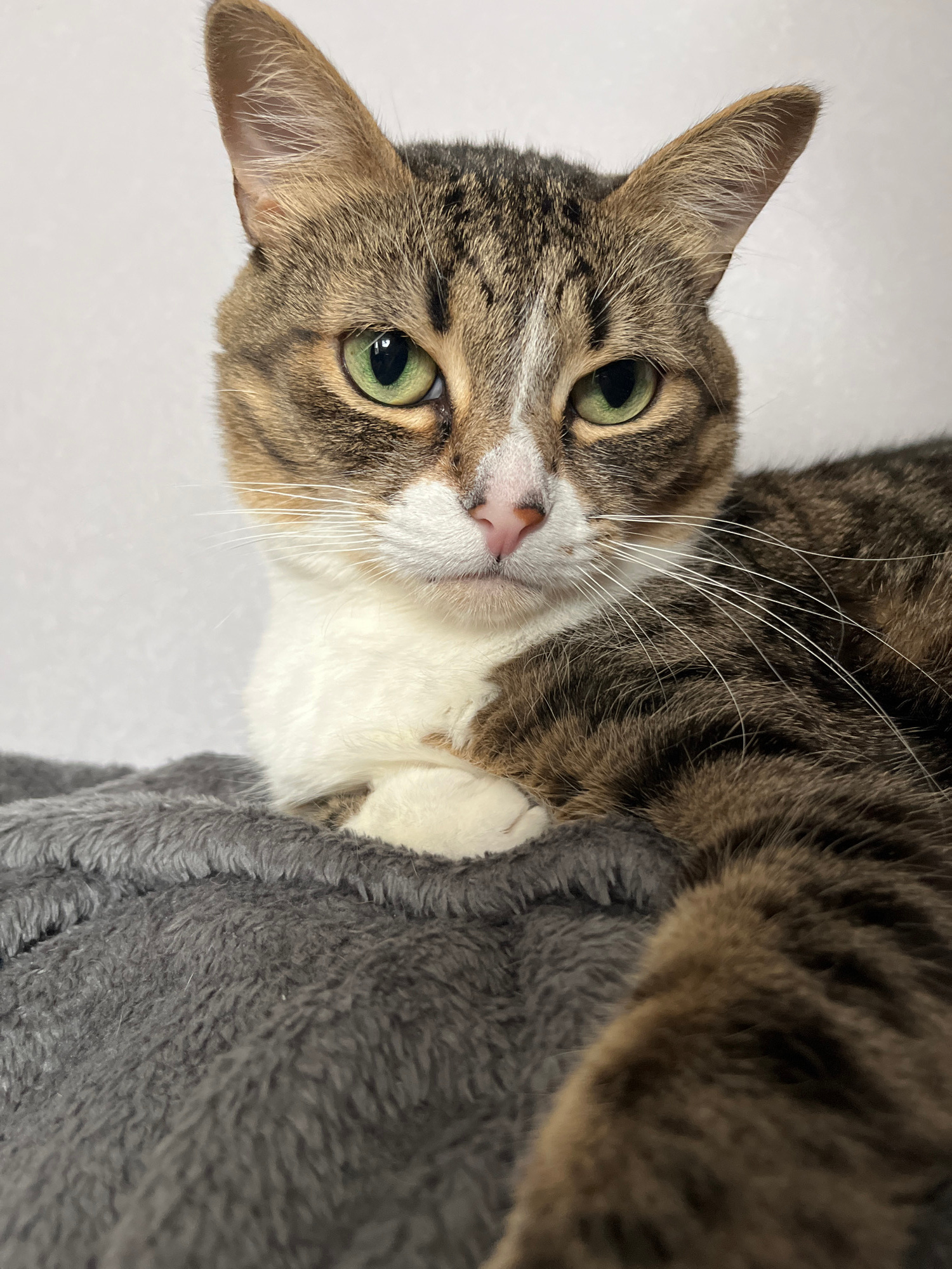 A close-up shot depicts a brown tabby cat with green eyes and a pink nose. The cat has a white patch on its chest and white whiskers. The cat is lying on a gray, plush surface. The background is a pla…read more