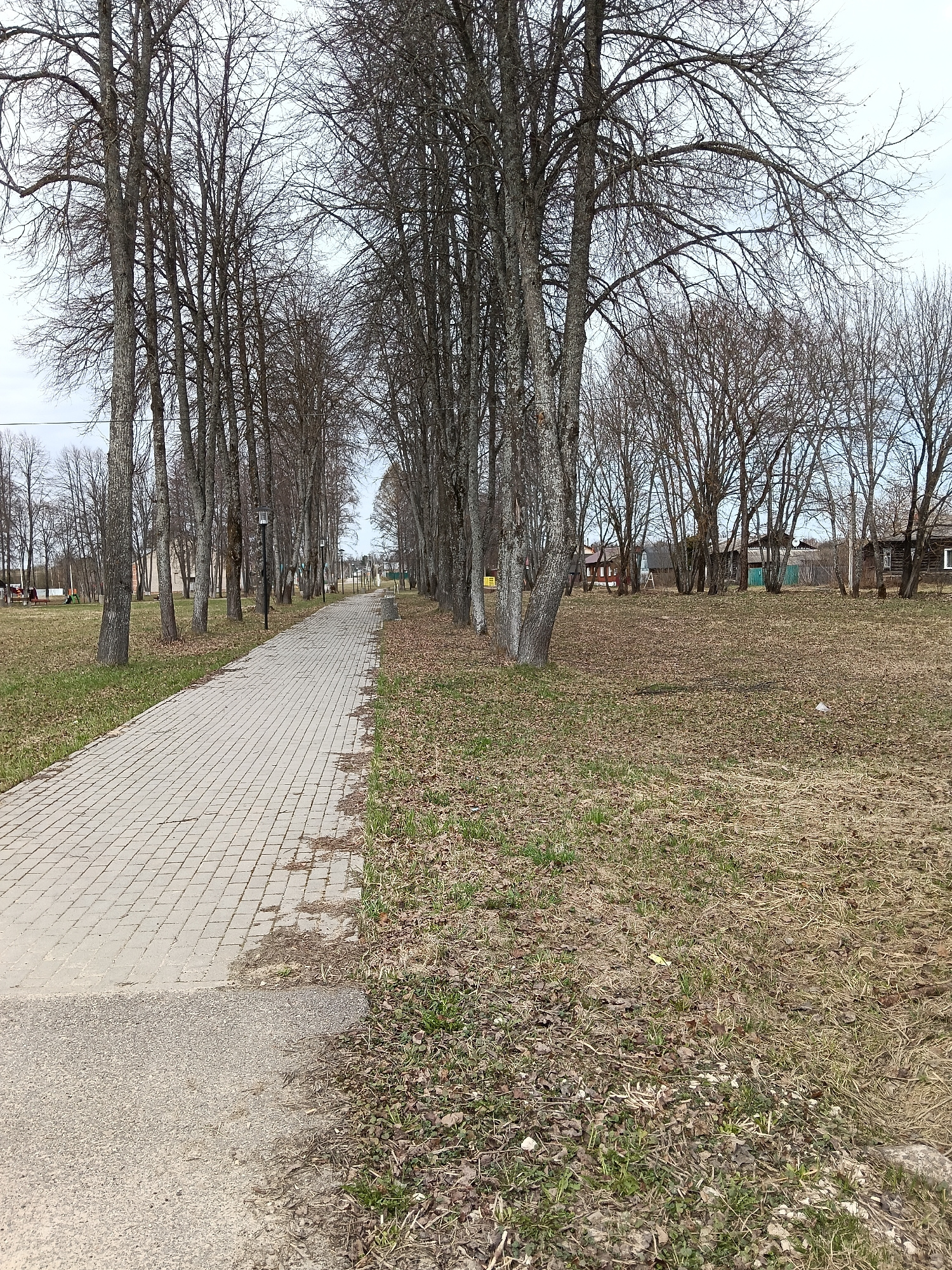 The image shows a paved path lined with bare trees in Красный Маяк, Russia. To the right of the path is a grassy area covered with dry leaves and sparse green vegetation. In the background, there are…read more