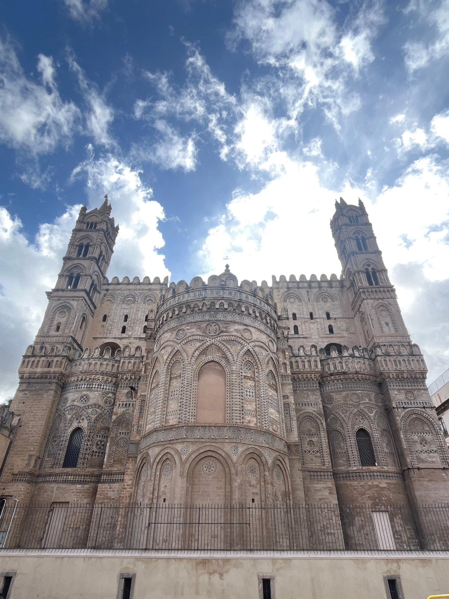 An upward-angle wide shot captures the imposing structure of the Palermo Cathedral, located in Palermo, Italy, against a dynamic sky. The cathedral, constructed primarily of light brown and gray stone…read more
