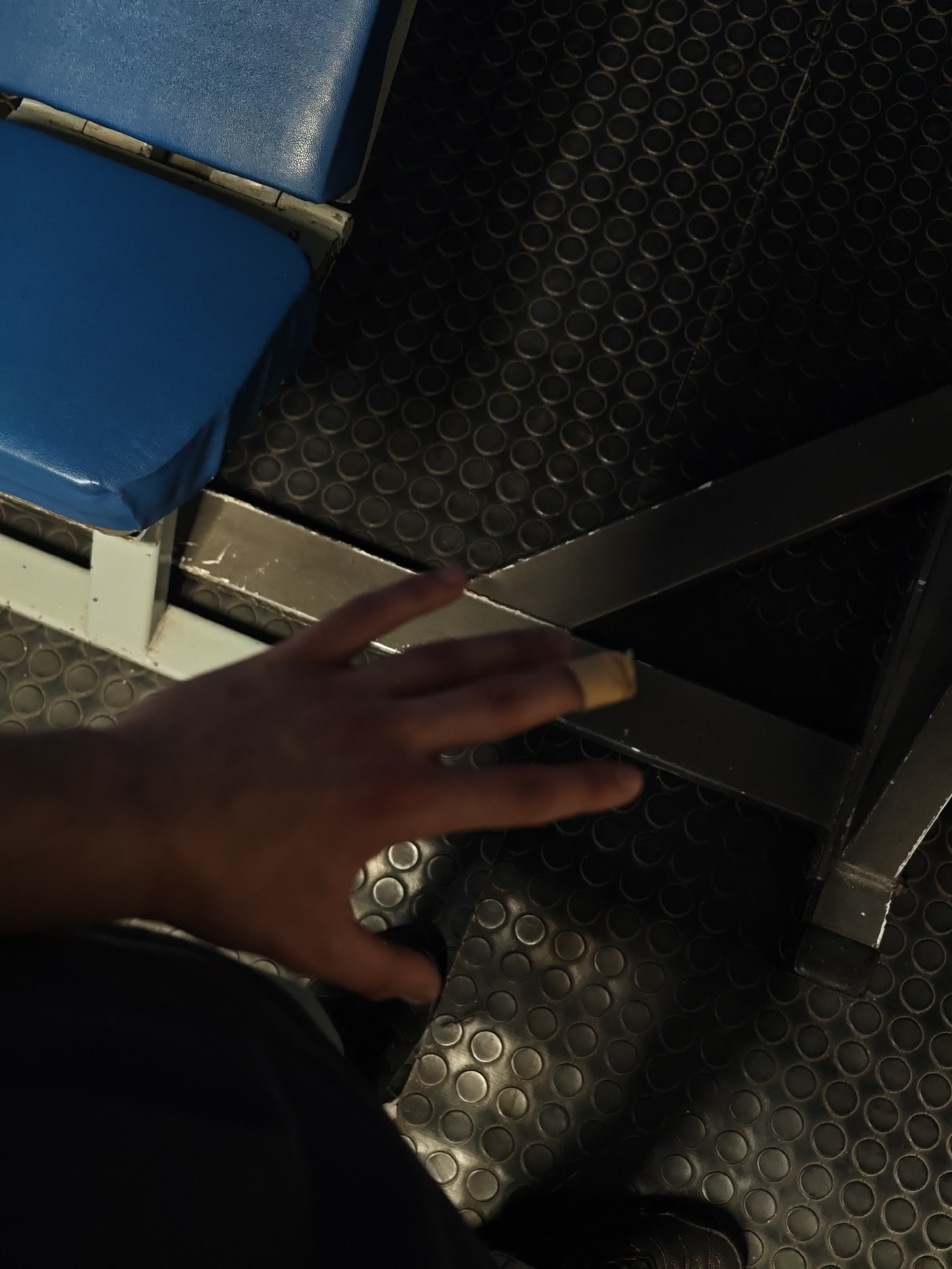 The image shows a first-person perspective of a person sitting on a blue padded seat in what appears to be a gym or fitness area. The person's left hand is visible, with a bandage on their index finge…read more