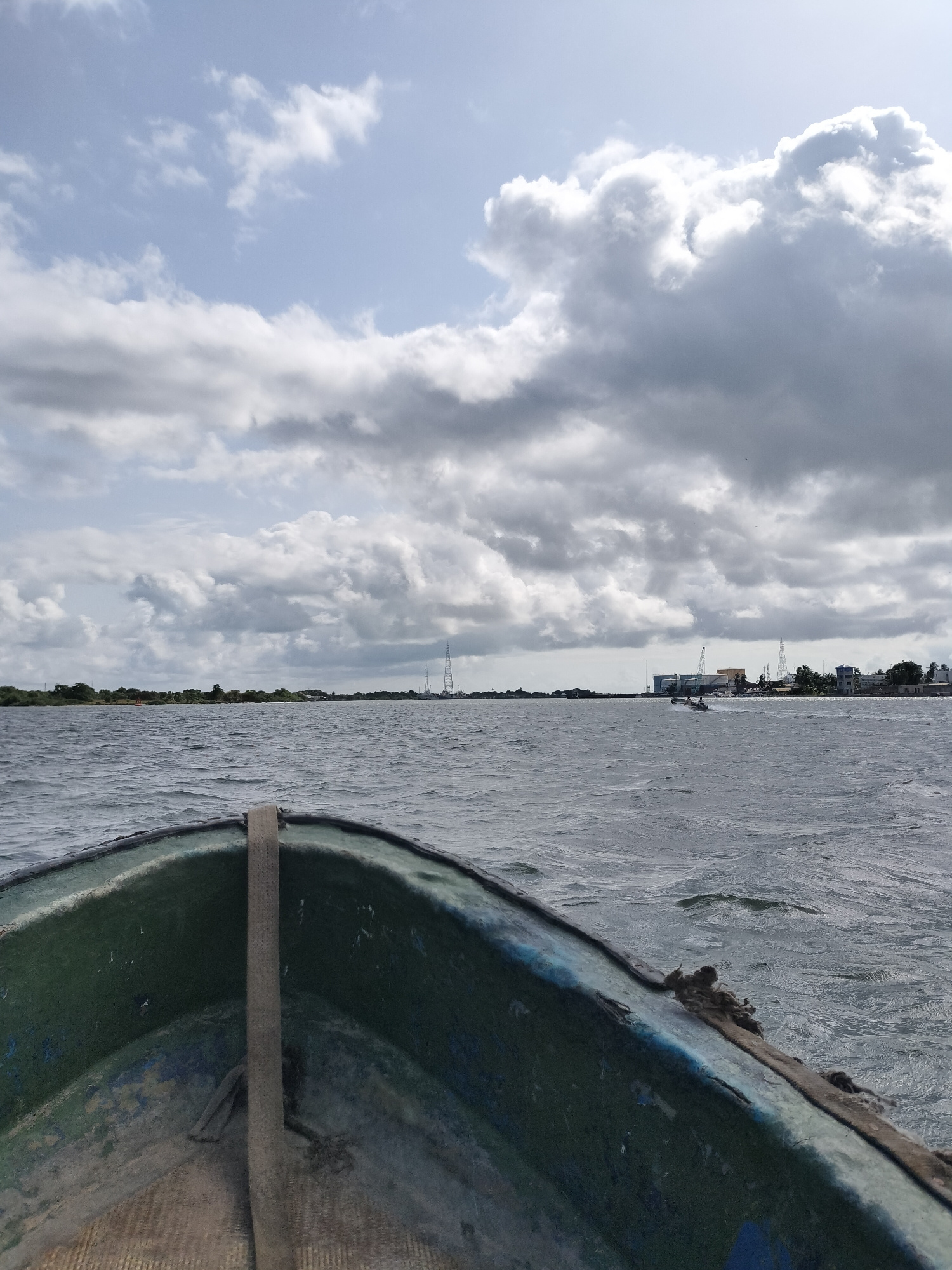 The image shows a view from a small, weathered boat on a body of water, presumably a lagoon or waterway in Lagos, Nigeria. The boat's interior is worn and painted in shades of green and blue, with a w…read more