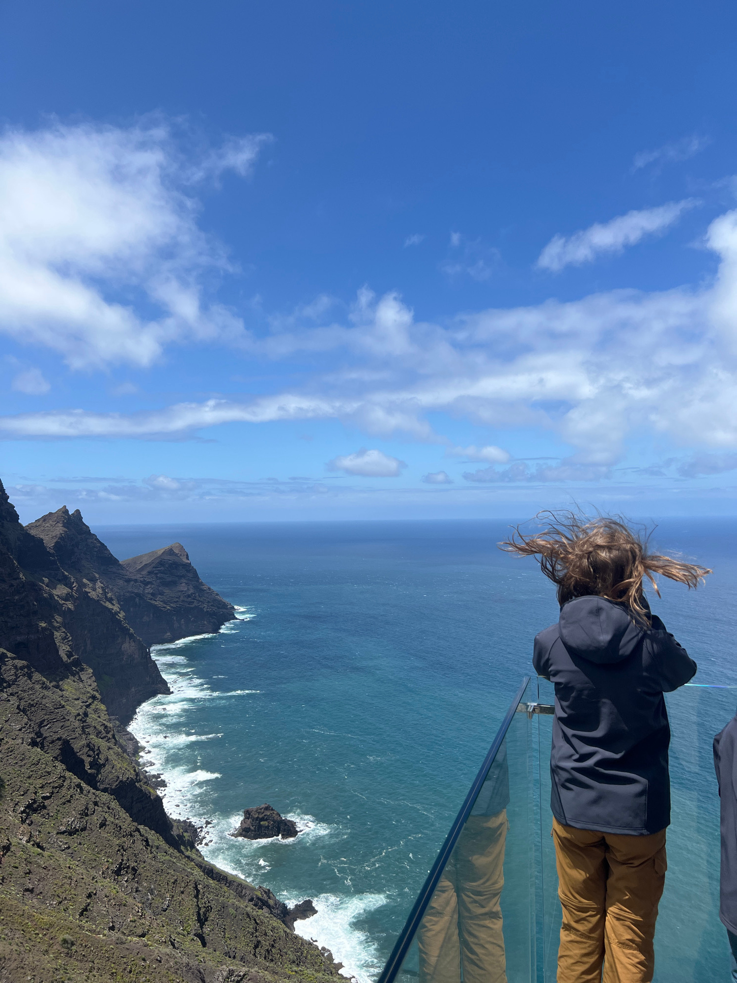 A person stands at the edge of a glass platform, gazing down at a rocky coastline and turbulent sea in La Aldea de San Nicolás, Spain. The subject, facing away from the camera, has long, windblown hai…read more