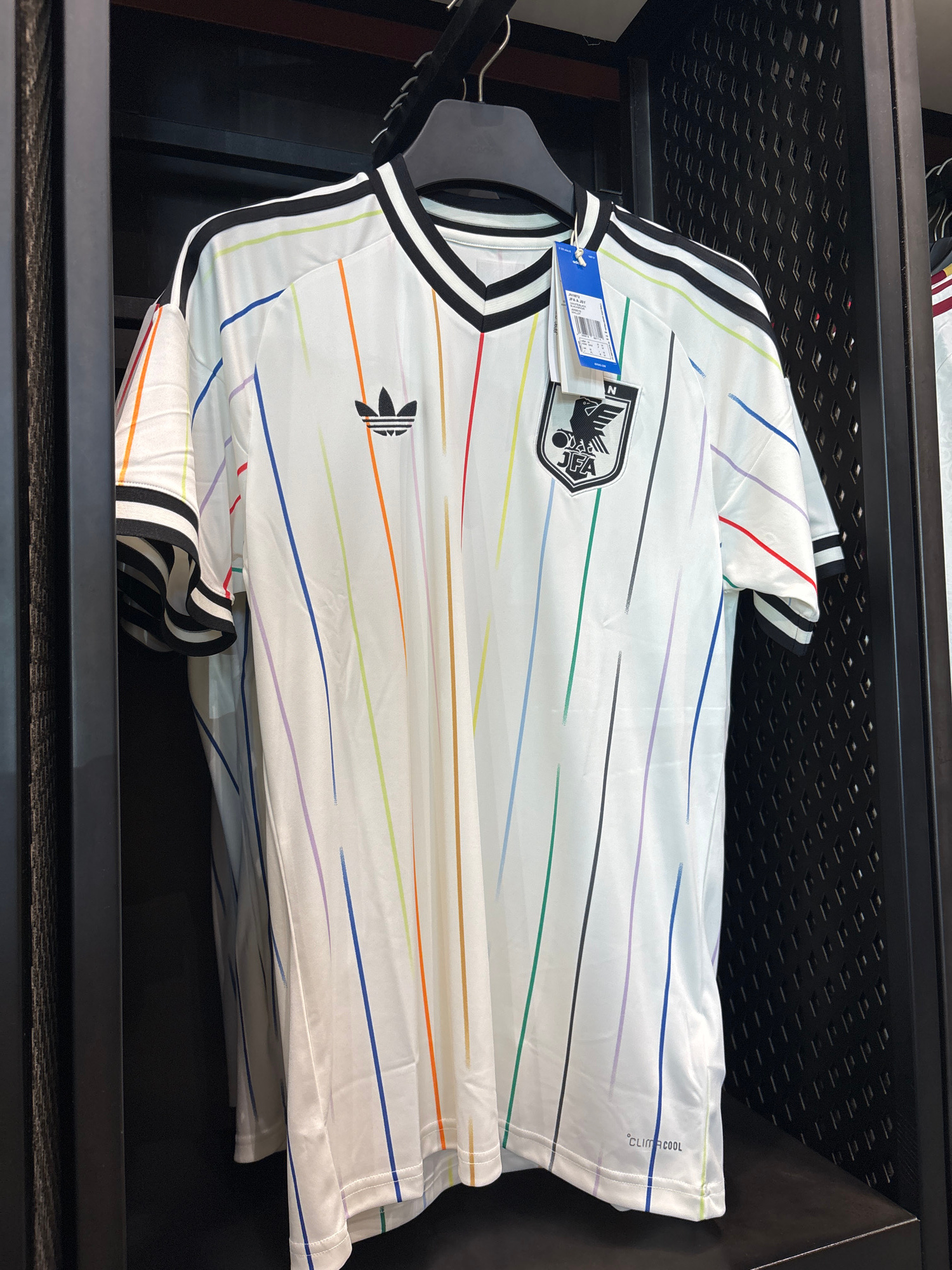 A white Adidas soccer jersey with colorful stripes is folded and placed on a hanger within a black, grated shelf. The jersey has the Adidas logo and the Japan Football Association (JFA) crest. A blue…read more