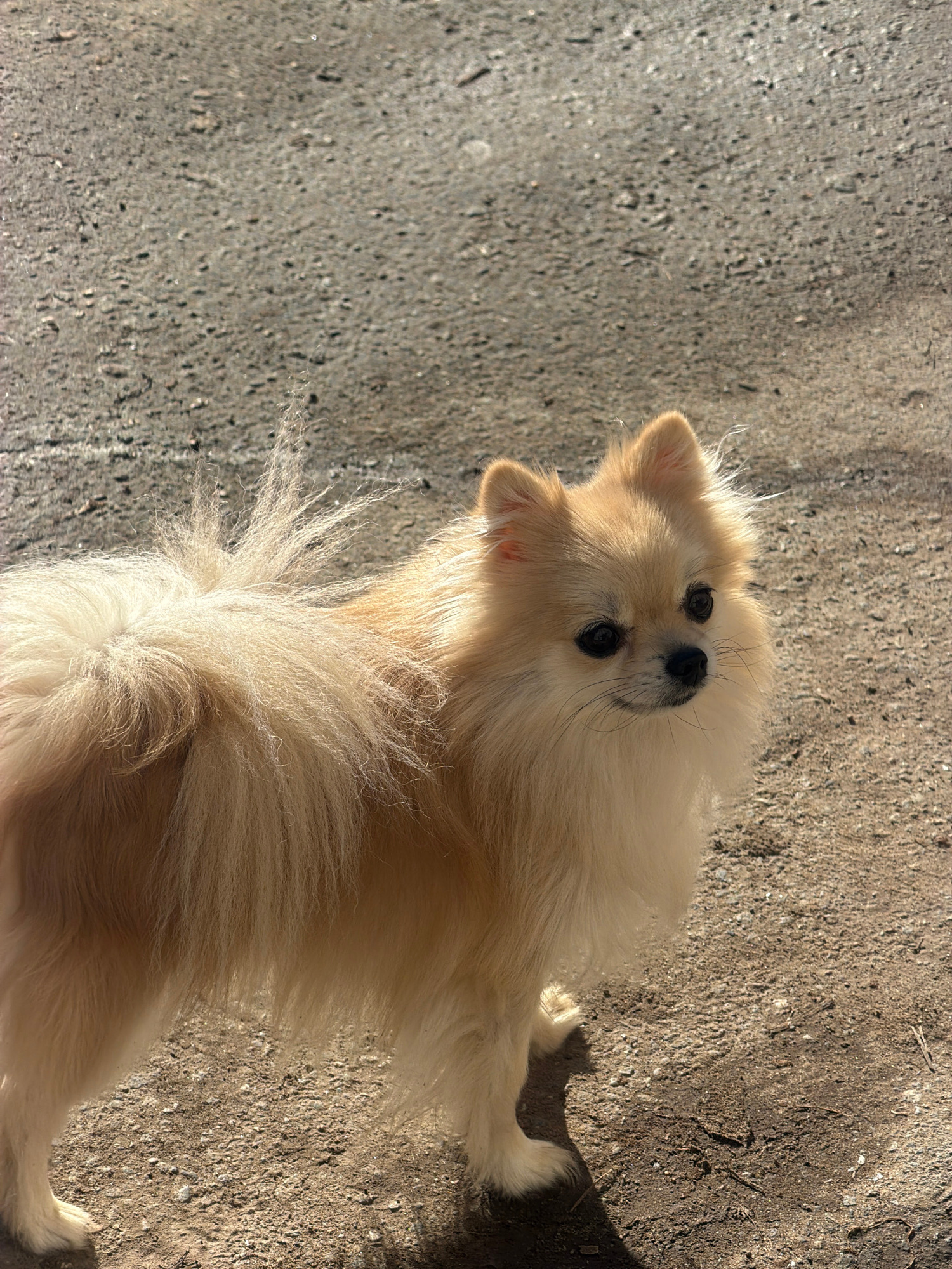 A light-cream colored Pomeranian dog is looking upwards at the camera. The dog is positioned on a paved surface. The location is Chaikovsky, Russia.