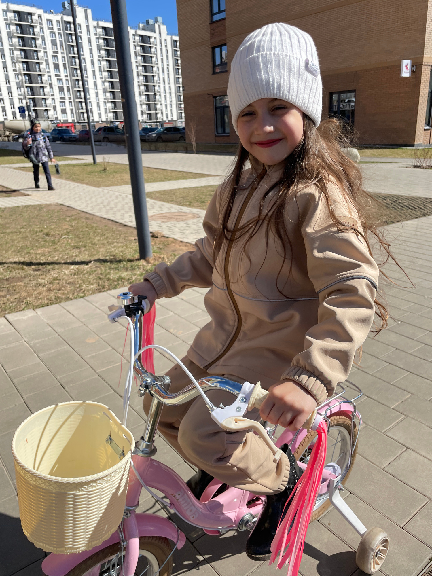 A young girl in a white knitted hat and beige jacket smiles while riding a pink bicycle with a white basket and pink tassels on the handlebars. The scene is outdoors, with a paved walkway and patches…read more