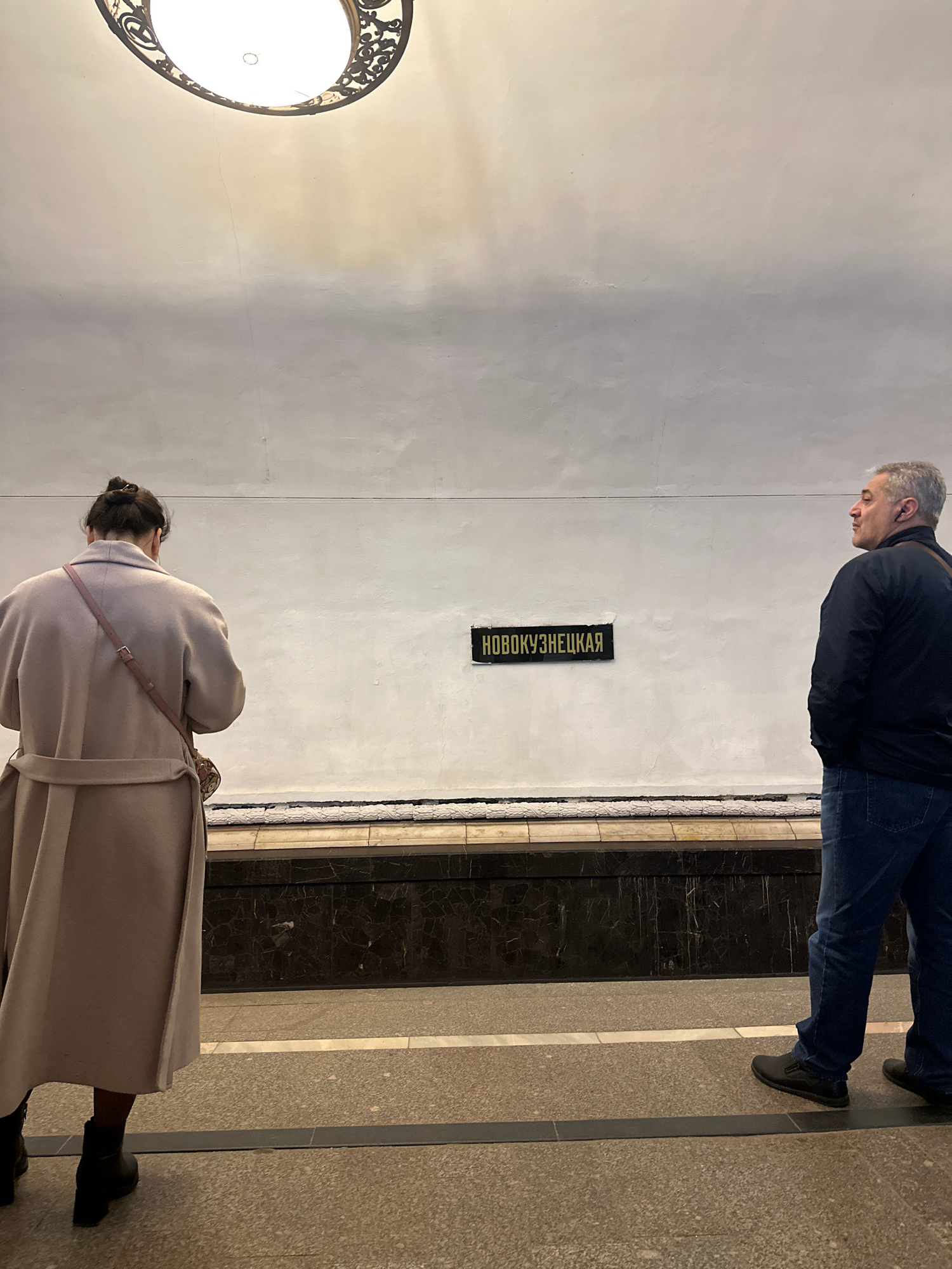 A man and a woman are in the Novokuznetskaya metro station in Moscow, Russia. The man is standing while the woman is looking down. The metro station's name is in Russian on the wall.