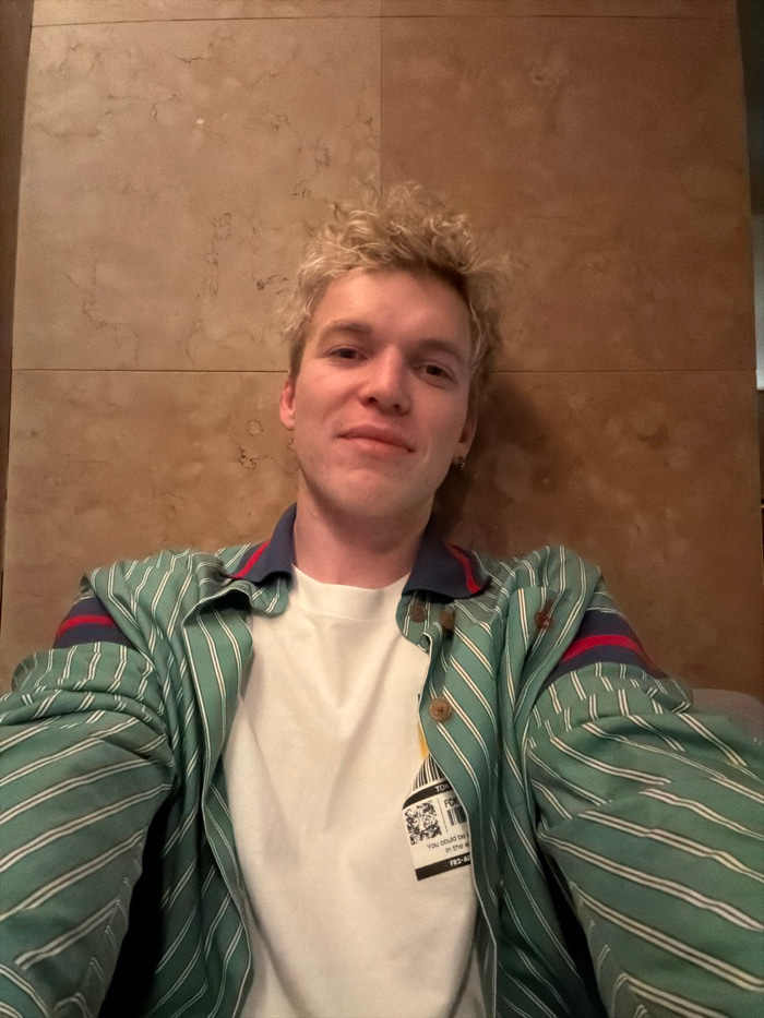 A young adult male with light blonde, curly hair and light skin is depicted in a close-up, head-and-shoulders selfie, looking directly at the camera with a slight smile. He wears a white t-shirt featu…read more