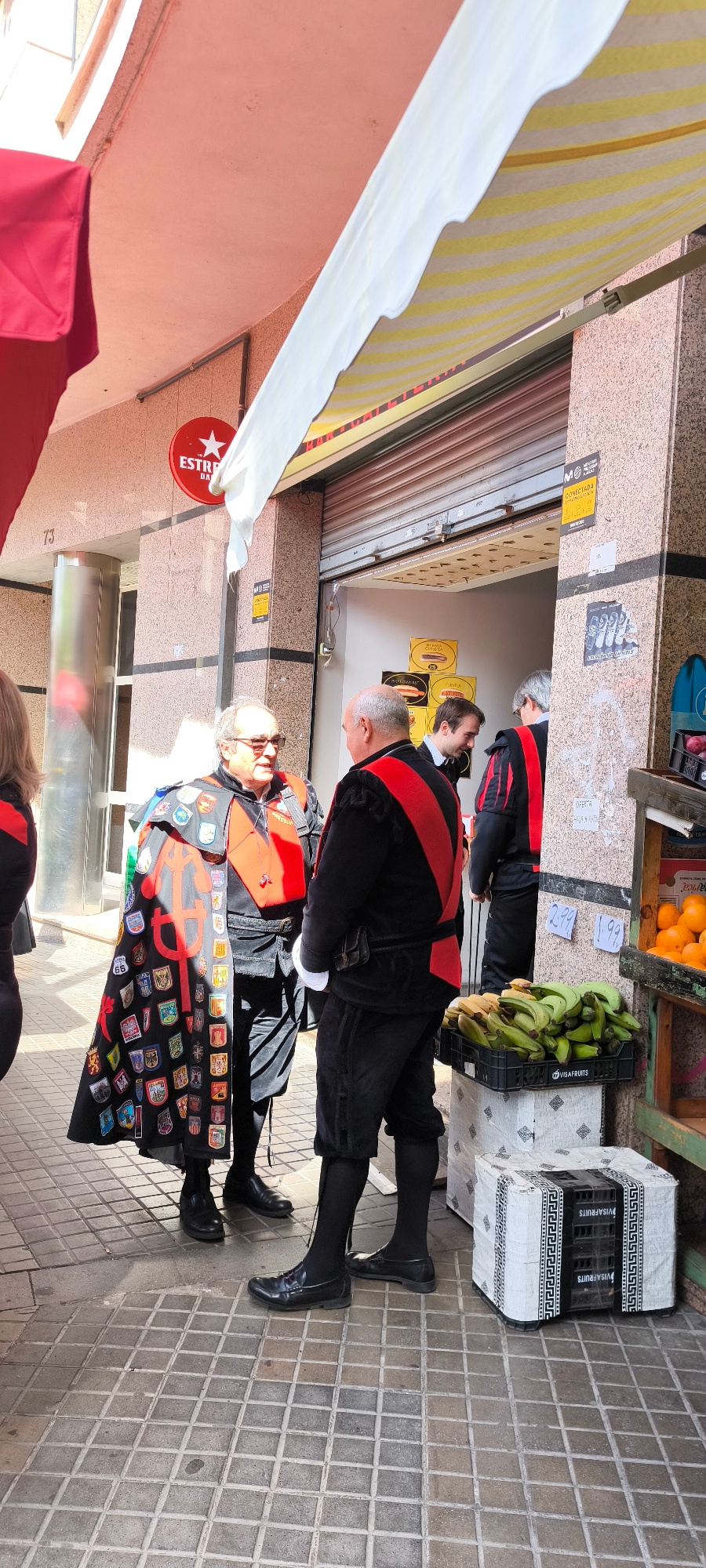 The image shows a street scene in Ripollet, Spain. Three men are visible, two of whom are prominently featured in the foreground and are dressed in traditional clothing. These men are wearing black ou…read more