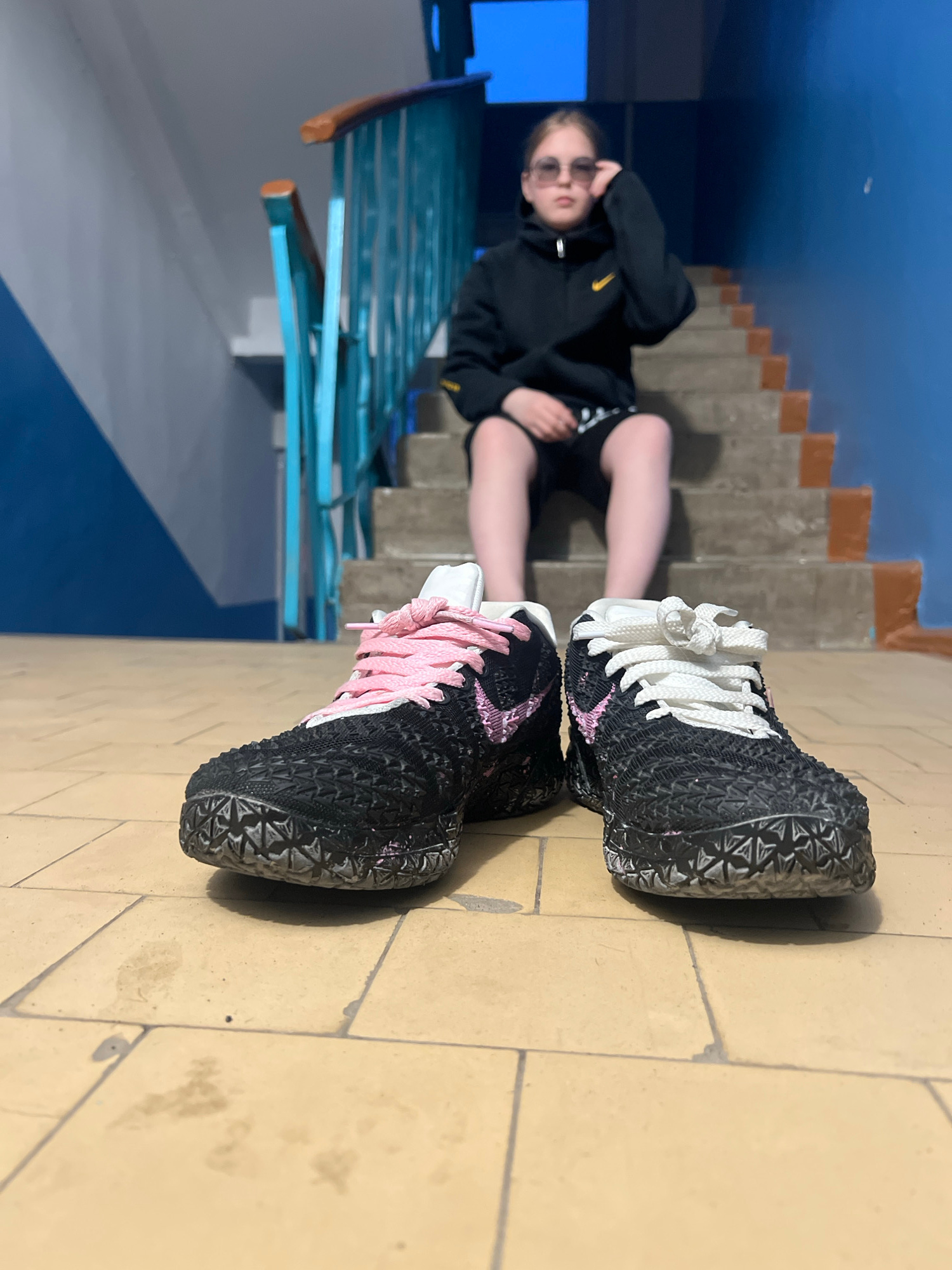 An indoor scene in Chaikovsky, Russia, features a young person reclining on a staircase, with two pairs of sneakers prominently displayed on the tiled floor beside them. The image is captured with art…read more